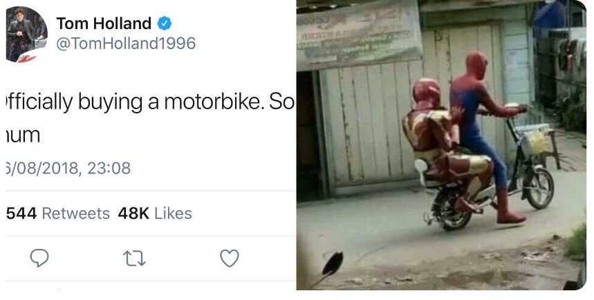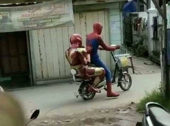 Thế nhưng ở một diễn biến khác, fan vừa bất ngờ vừa không thể nhịn cười khi chứng kiến cảnh tượng vô cùng “éo le”: anh chàng Spider Man đang ung dung chở “chú Tony Stark” - người giàu có bậc nhất thế giới - trên một chiếc xe đạp mini. Không ai khác, hình ảnh này được đăng tải bởi chính tài tử Robert Downey Jr. - nam diễn viên thủ vai Iron Man trong phim.