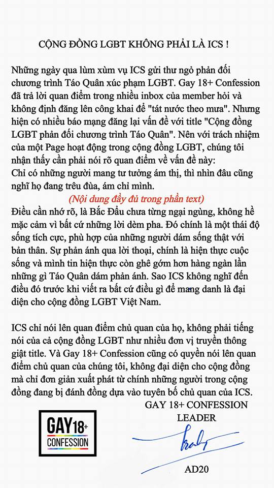 Gay 18+ Confession. là một fanpage lớn hoạt động trong giới LGBT của Việt Nam, với hơn 45.000 lượt người yêu thích và theo dõi. Fanpage khẳng định những gì ghi trong văn bản cũng là ý kiến của họ, “không đại diện cho cộng đồng mà chỉ đơn giản xuất phát từ chính những người trong cộng đồng đang bị đánh đồng dựa vào tuyên bố chủ quan của ICS”.