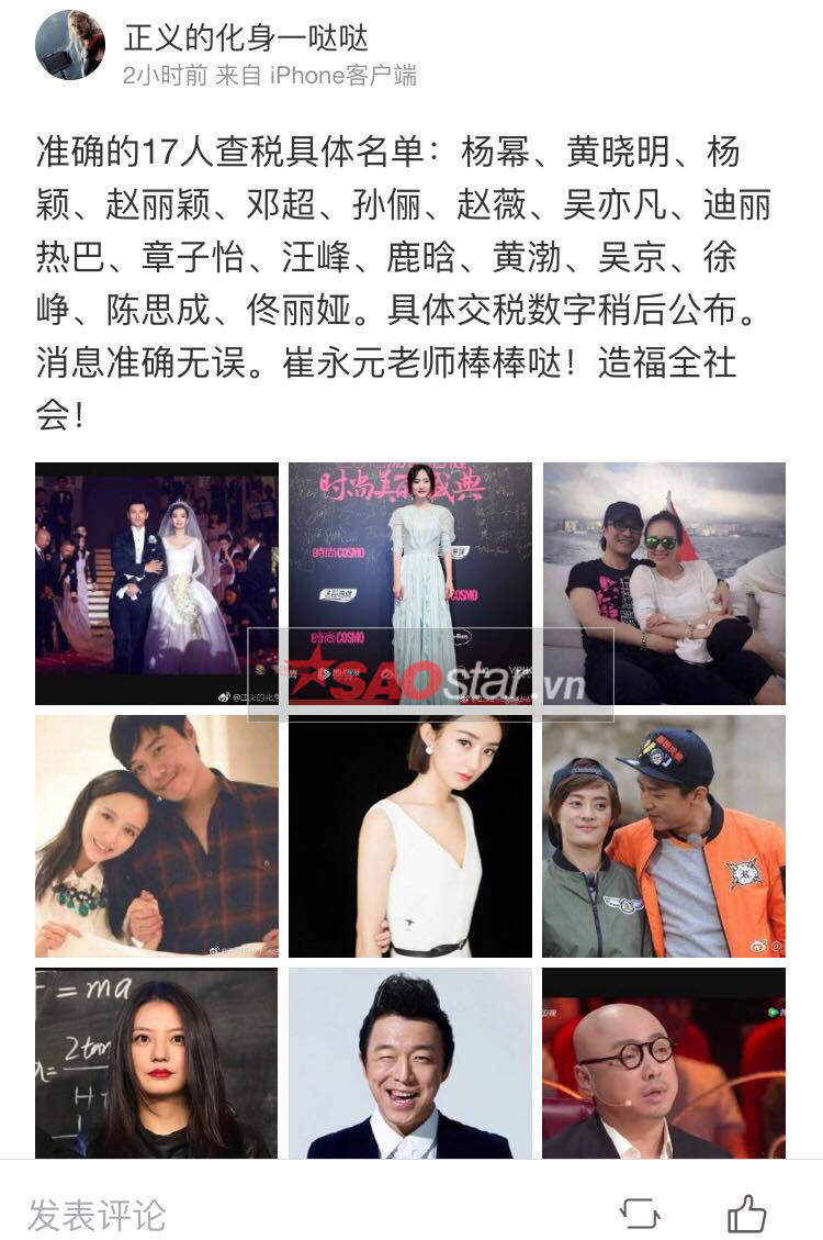 Ngày 1 tháng 12, một trang Weibo chính thức thuộc trang giải trí Sina đã ngầm gợi ý về danh tính 17 nghệ nhân liên quan đến vấn đề phải bổ sung thuế lần này đều là những lưu lượng thịt tươi, tiểu hoa, đại hoa, những cặp vợ chồng nổi tiếng hiện nay, đạo diễn…. Mỗi một người với một mức khác nhau, và số khoản thuế mỗi người cần phải bù vào ước tính đạt hơn trăm triệu NDT. Trong đó: