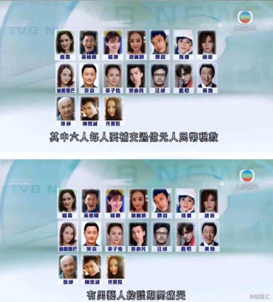 Khi mọi người vẫn còn đang nghi ngờ về độ xác thực của những tin tức này thì mới đây, một trang weibo Sina tài chính đã chia sẻ một bài viết cho biết kênh truyền hình vô tuyến TVB trong bảng tin tức mới nhất đã đưa tin, tiết lộ danh sách 17 nghệ nhân cần được bổ sung, “nộp thuế chậm”. Người dẫn chương trình cho biết trong “list” này có sáu người, khoản thuế cần phải bổ sung vượt quá trăm triệu NDT. Khi được Tổng cục mời đến nói chuyện, trong cuộc hội nghị lúc đó có một nam minh tinh đã đau khổ mà bật khóc.