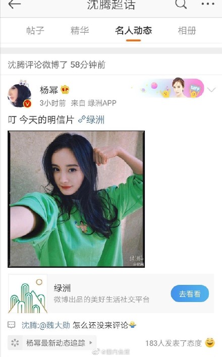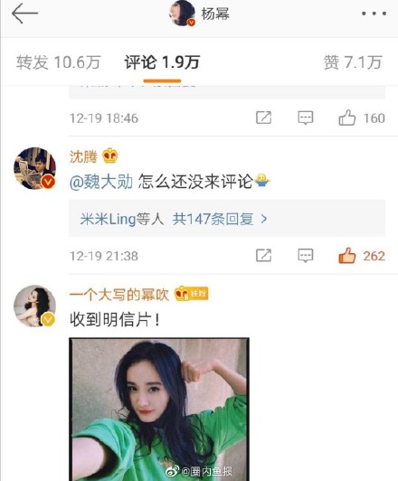 Tối nay (19.12), Dương Mịch đăng tải tấm hình selfie lên mạng xã hội weibo. Sau đó, nam diễn viên - đạo diễn Thẩm Đằng bất ngờ bình luận dưới bài viết, còn nhắc đến tài khoản weibo của Ngụy Đại Huân và hỏi: “Sao còn chưa đến bình luận?“. Vài phút sau, Thẩm Đằng xóa dòng bình luận thu hút sự tranh luận của cư dân mạng.