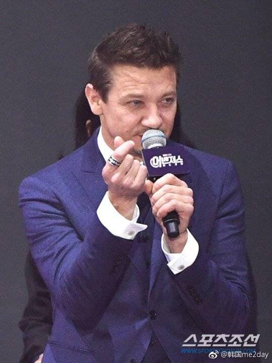 Jeremy Renner nói: “Cảm ơn vì sự hiếu khách của người hâm mộ Hàn Quốc, tôi đã đến Cung Cảnh Phúc, nơi đó thật sự rất đẹp. Đó là một ngày rất kỳ diệu, tôi đã ăn đồ ăn Hàn Quốc, và soju rất ngon”.