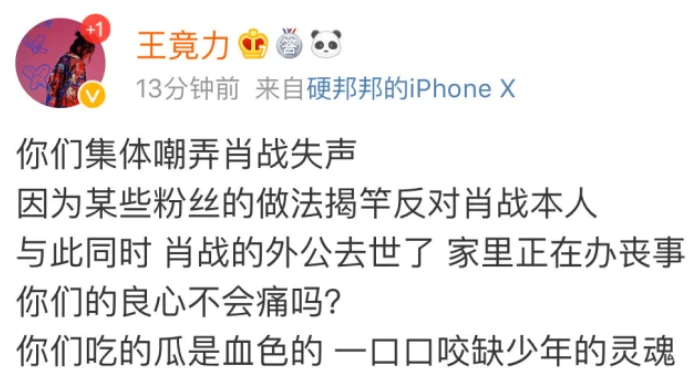 Dưới sức ép dư luận thì cách đây vài ngày, bạn thân Tiêu Chiến là Vương Cánh Lực bất ngờ lên tiếng thể hiện sự bất bình thay cho bạn mình. Ngoài ra, người này còn cho biết ông ngoại Tiêu Chiến đã qua đời, nhà đang có tang sự. Có điều, Tiêu Chiến vẫn tiếp tục chọn cách im lặng với những gì đã xảy ra.