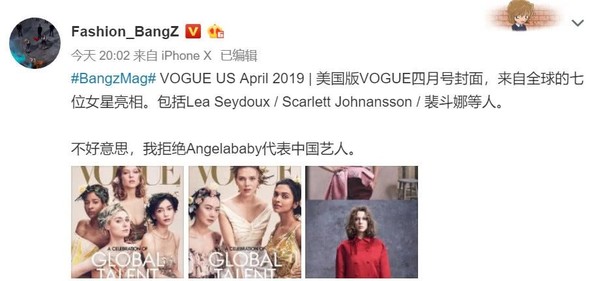 Là ngôi sao đầu tiên của Trung Quốc có vinh dự rất lớn khi xuất hiện trên trang bìa tạp chí VOGUE bản Mỹ, thế nhưng Angelababy lại gây tranh cãi lớn. Với chủ đề cho số tạp chí tháng 04/2019 “Tài năng toàn cầu - 14 quốc gia, 14 siêu sao“, không xét đến chữ “Tài năng” thì vốn dĩ muốn xuất hiện trên VOGUE trước tiên phải được khán giả ghi nhận bởi tác phẩm tiêu biểu hay chứng minh khả năng diễn xuất qua những giải thưởng danh giá. Tác phẩm hay thì chẳng có, lối diễn trước giờ của cô nàng nổi danh vô cùng thảm họa, thế mới nói tại sao Angelababy xuất hiện trên VOGUE lại gây tranh cãi lớn đến như vậy.