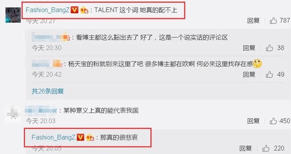 “Từ TALENT này, cô ấy thật không xứng với nó“ - Một blogger thời trang lớn với hơn 3,5 triệu follow thẳng thắn nhận xét. Đảm nhận vai trò quá lớn khi đại diện tài năng của cả đất nước Trung Quốc, gạch đá liên tục hướng về “bà xã Huỳnh Hiểu Minh”. Chưa kể, thần thái, cách tạo dáng của Angelababy so với đồng nghiệp quốc tế bị dìm dữ dội, ánh mắt cô vô hồn thiếu sức sống, một Angelababy xuất thần ở những trang tạp chí Trung biến đi đâu mất rồi?