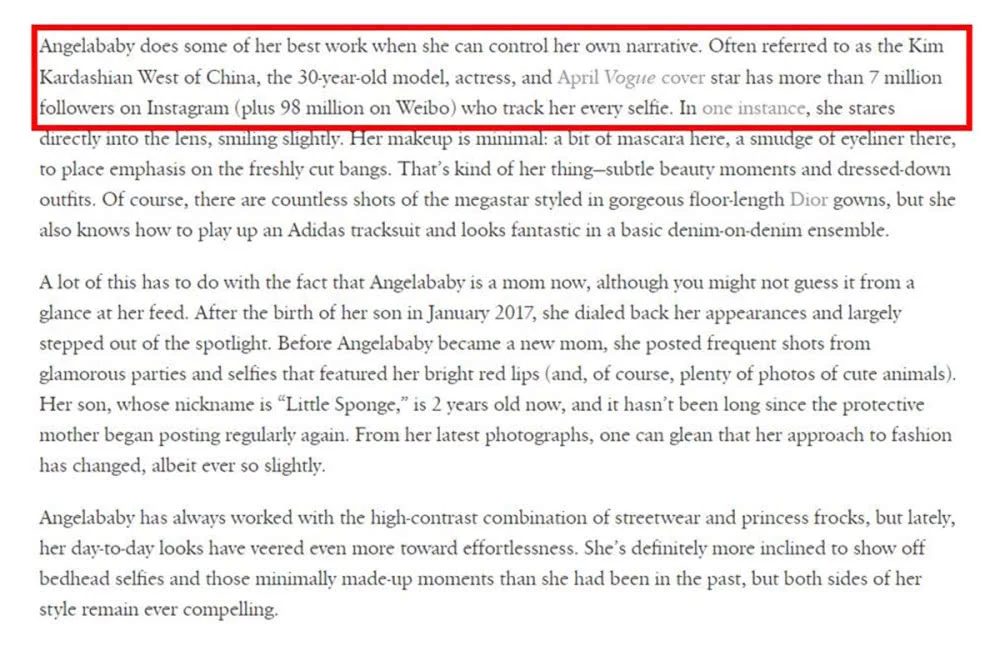 Chưa hết, ngay phần giới thiệu của từng “TALENT” đến độc giả, những cái tên khác đều được VOGUE gọi bằng vai trò cụ thể diễn viên với những miêu tả chi tiết họ giúp đỡ, ảnh hưởng như thế nào với xã hội, tài năng thành tích họ đến đâu. Còn với Angelababy tạp chí này chỉ ghi vài dòng cho thấy độ nổi tiếng của cô như thế nào tại Trung Quốc, có bao nhiêu fan trên các diễn đàn mạng xã hội. Đọc vào phần chú thích của cô nàng, độc giả quốc tế chỉ có thể nhớ đến cô như một ngôi sao mạng xã hội, hot face, còn tài năng thì chẳng thấy đâu để phù hợp đại diện Trung Quốc với chủ đề “TÀI NĂNG TOÀN CẦU”. Có lẽ VOGUE dùng từ rất đúng khi so sánh, ví von Angelababy là Kim Kardashian của Trung Quốc.