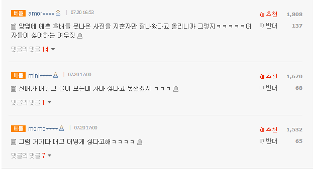1. [+1,808, - 137] Mọi người đang chỉ trích bạn vì bạn đã tải lên hình ảnh khi biết rằng mình là người duy nhất xinh đẹp và hai hậu bối bên cạnh khá tệ ㅋㅋㅋ ㅋㅋㅋ đây là loại hành động mà phụ nữ cực ghét