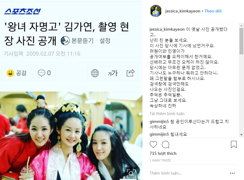Phản hồi lại cư dân mạng, Kim Ka Yeon trút sự thất vọng của mình qua Instagram, cô ấy chia sẻ: “Hãy nhìn xem, những người đang phát điên vì tôi đã đăng bức ảnh cũ này. Thậm chí một bài báo không hay còn được viết vào lúc đó. Rye Won và Min Young đã đồng ý để tôi chia sẻ bức ảnh. Họ không đồng ý bởi vì tôi là một tiền bối. Vào thời điểm lúc bấy giờ chuyện này không phải là vấn đề nghiêm trọng và không ai nói gì về nó cả. Tại sao bây giờ mọi người lại chỉ trích? Các bạn có thể dễ dàng thấy bức ảnh này khi tìm kiếm trên mạng. Kỷ niệm là kỷ niệm. Thật sự rất khó chịu”.
