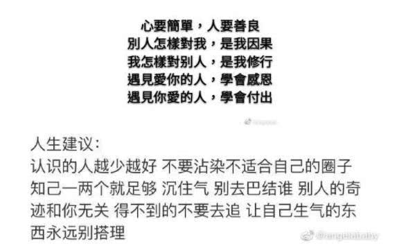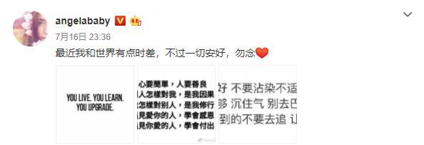 Angelababy vốn là tiểu hoa nổi tiếng trong ngành giải trí Hoa ngữ hiện nay, nhất cử nhất động của cô luôn thu hút sự quan tâm của cư dân mạng. Tối ngày 16 tháng 8, Angelababy đột nhiên đăng bài cảm khái lên trên trang cá nhân weibo của mình: “Gần đây tôi có chút sai lệch thời gian với thế giới. Có điều tất cả đều tốt đẹp, đừng nhớ”.