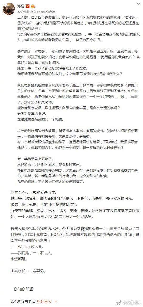 Ngày 11 tháng 2 vừa qua, chương trình gameshow Keep Running (奔跑吧) đã đăng weibo công bố dàn diễn viên mùa mới nhất. Theo đó các ngôi sao Đặng Siêu, Trần Hách, Lộc Hàm, Vương Tổ Lam vì lý do công việc cá nhân nên sẽ không tham gia ghi hình. Lý Thần, Angela Baby, Trịnh Khải sẽ tiếp tục tham gia Keep Running mùa này. Đồng thời, Chu Á Văn, Vương Ngạn Lâm, Hoàng Húc Hi và Tống Vũ Kỳ sẽ là 4 gương mặt mới tham dự Keep Running.