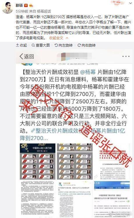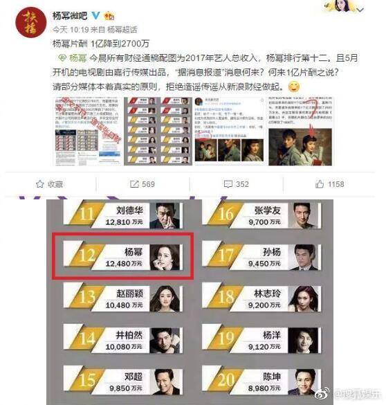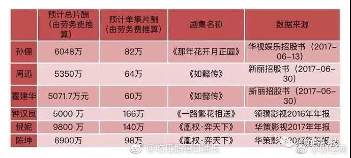 Được biết cách đây vài ngày ba kênh mạng lớn là Đằng Tấn QQ, Ái Kỳ Nghệ, Youku cùng với sáu công ty sản xuất lớn đã cùng nhau đưa ra thông báo về việc ngăn chặn hiện tượng thù lao “trên trời” của các nghệ sĩ minh tinh. Và vào ngày hôm sau đó, trên mạng xã hội đã lan truyền nhau bức ảnh được cho là danh sách các minh tinh có mức thù lao vượt quá 50 triệu nhân dân tệ, trong danh sách này gồm có các diễn viên nổi tiếng như (thứ tự dựa vào số cát sê tính theo từng tập):