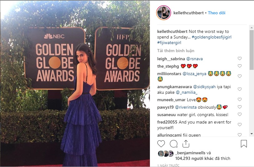 Có lẽ người thắng cuộc tại đêm trao giải Quả Cầu Vàng năm nay không phải là đạo diễn hay diễn viên nào mà là cô nàng tiếp thị nước với biệt danh Fiji Water Girl khiến cư dân mạng dậy sóng. Xuất hiện trên thảm đỏ với vai trò là nhân viên quảng bá/ tiếp nước cho sao, thế nhưng cô nàng Kelleth Cuthbert đã chiếm hết spotlight với thần thái sang chảnh ngay cả khi bưng khay nước.