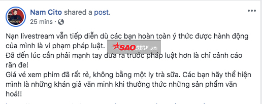 Ngoài ra trên trang cá nhân của mình, đạo diễn Nam Cito khẳng định: “Đã đến lúc cần phải mạnh tay đưa ra pháp luật hơn là chỉ cảnh cáo răn đe. Giá vé xem phim đã rất rẻ, không bằng một ly trà sữa. Các bạn hãy thể hiện mình là những khán giả văn minh khi thưởng thức những tác phẩm văn hóa”.