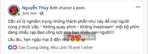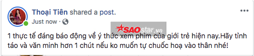 Diễn viên Thoại Tiên cũng bức xúc “một thực tế đáng báo động về ý thức xem phim của giới trẻ hiện nay. Hãy tỉnh táo và văn minh hơn một chút nếu không muốn tự chuốc họa vào thân”.