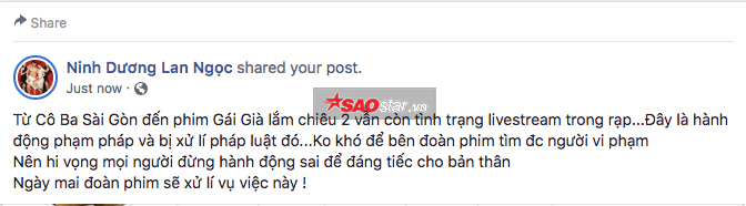 Nữ chính Ninh Dương Lan Ngọc - nạn nhân của cả hai bộ phim - cho biết: “Từ Cô Ba Sài Gòn đến Gái già lắm chiêu 2 vẫn còn tình trạng livestream trong rạp. Đây là hành động phạm pháp và bị xử lý pháp luật đó. Không khó để đoàn phim tìm ra người vi phạm nên hy vọng mọi người đừng hành động sai để đáng tiếc cho bản thân”.