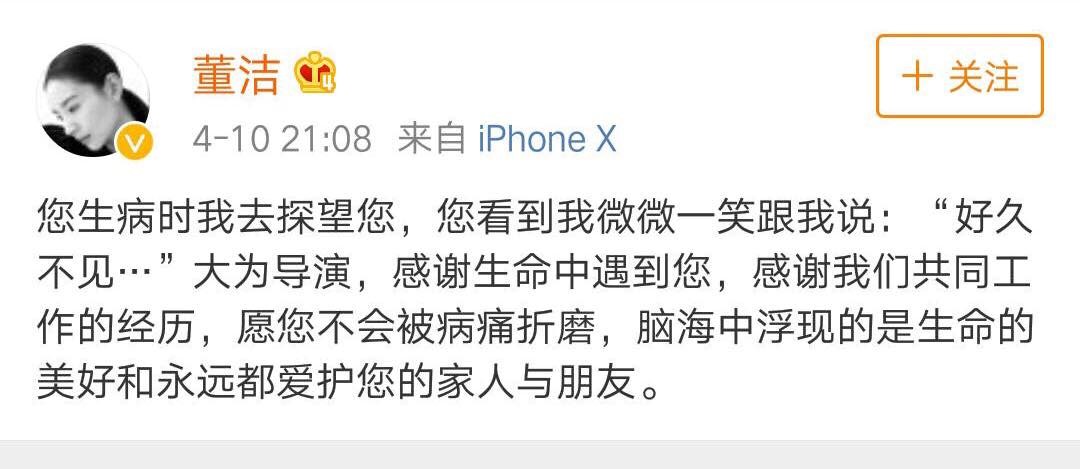 Đổng Khiết (Lãnh Thanh Thu) đăng Weibo với nội dung: “Tôi đã đi thăm ông ấy lúc ông ấy đang bệnh, ông ấy nhìn thấy tôi liền cười và bảo: ‘Lâu quá không gặp’… Đại Vi đạo diễn, cảm tạ sinh mệnh đã cho tôi gặp được ngài, cảm tạ chúng ta đã được cùng nhau làm việc. Nguyện rằng ngài sẽ không bị bệnh tật tra tấn, trong tâm khảm tôi luôn hiển hiện là chính là cuộc đời tươi đẹp của ông, tôi sẽ mãi mãi bảo vệ người thân và bạn bè của ngài.”