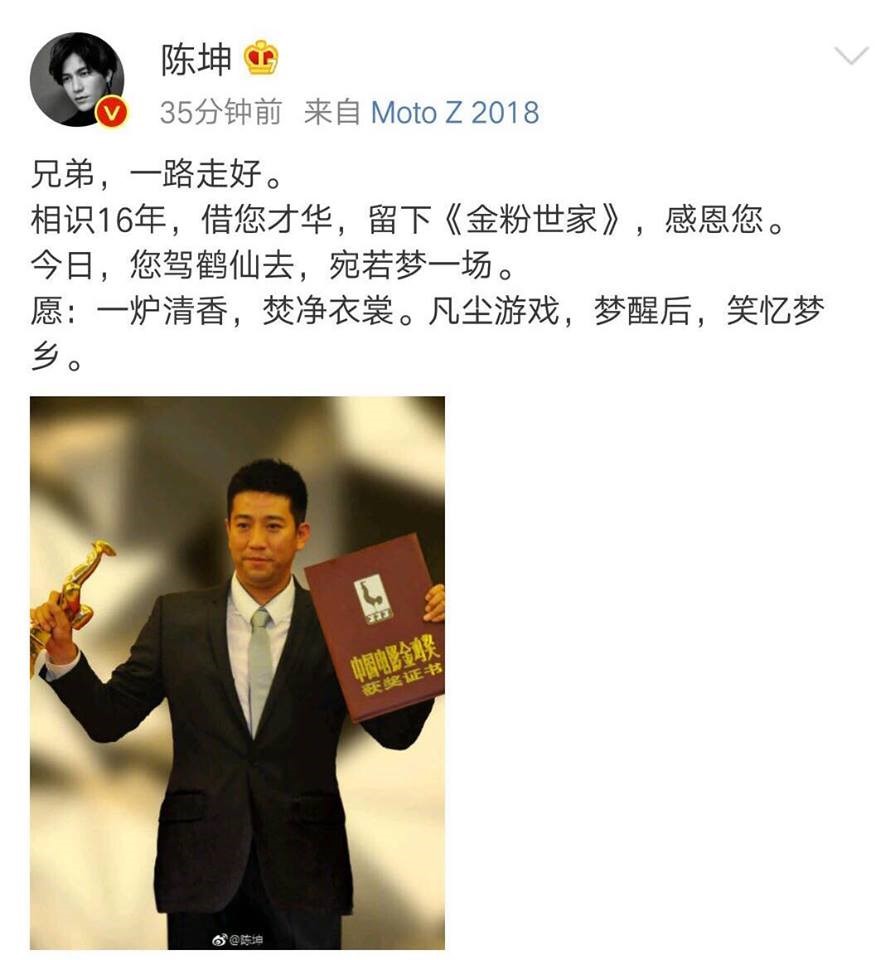 Trần Khôn cũng đã cập nhật Weibo khi biết đạo diễn Lí Đại Vi qua đời…