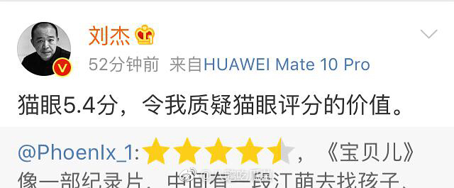 Ngay khi đạo diễn Lưu Kiệt nhìn thấy đứa con tinh thần của mình chỉ được 5.4 điểm trên Maoyan đã tỏ ra nghi ngờ về giá trị của nó: “Maoyan 5.4 điểm, làm tôi cảm thấy nghi ngờ về giá trị đánh giá, bình luận của Maoyan”.