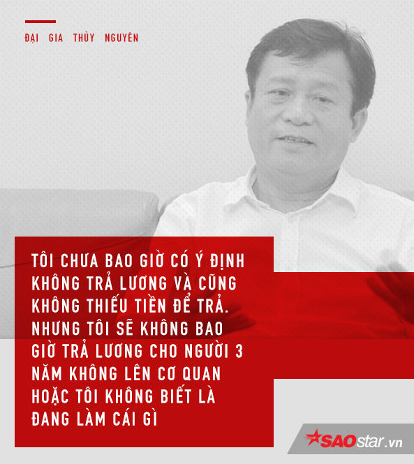 Không chỉ vậy, ông Thủy Nguyên cho rằng, mình trả lương cho đúng người đúng việc, “tôi chưa bao giờ có ý định không trả lương và cũng không thiếu tiền để trả. Nhưng tôi sẽ không bao giờ trả lương cho người 3 năm không lên cơ quan hoặc tôi không biết là đang làm cái gì”. Ngay sau đó, ông Thủy Nguyên đã yêu cầu phòng nhân sự, ban quản lý lấy dấu vân tay của toàn bộ cán bộ, công nhân viên của hãng phim (tức Công ty cổ phần Đầu tư và Phát triển phim truyện Việt Nam hiện nay) nhằm áp dụng hình thức chấm công bằng vân tay.