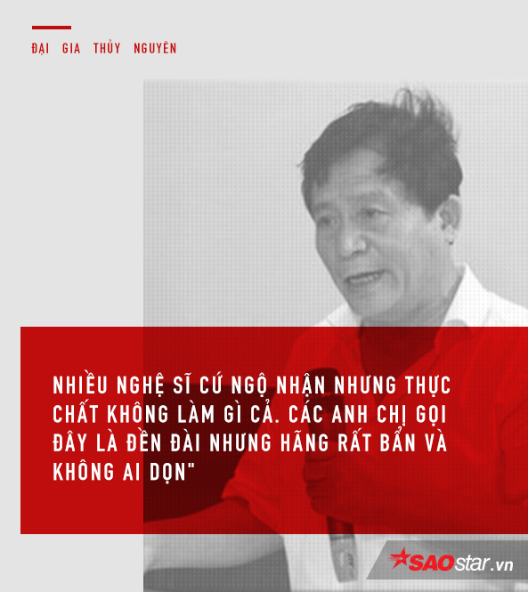 Bên cạnh đó, vị đại gia này cũng đã lên tiếng phê bình: “Nhiều nghệ sĩ cứ ngộ nhận nhưng thực chất không làm gì cả. Các anh chị gọi đây là đền đài nhưng hãng rất bẩn và không ai dọn”.