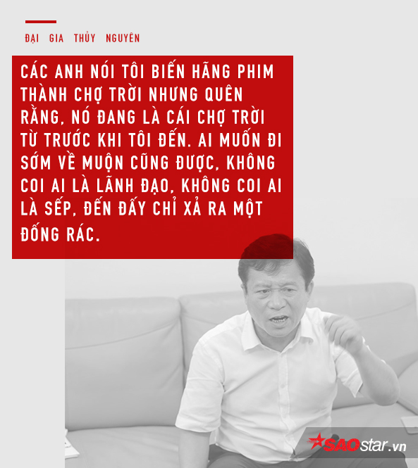 Trong cuộc tiếp xúc với báo chí gần đây, đại gia Thủy Nguyên tiếp tục gây tranh cãi khi bất ngờ nói Hãng phim truyện Việt Nam là cái chợ trời từ trước khi ông đến: “Các anh nói tôi biến Hãng phim thành chợ trời nhưng quên rằng, nó đang là cái chợ trời từ trước khi tôi đến. Ai muốn đi sớm về muộn cũng được, không coi ai là lãnh đạo, không coi ai là sếp, đến đấy chỉ xả ra một đống rác. Hãng thì ngập rác nhưng không ai dọn. Lúc tôi cho người dọn thì lại vu cho tôi làm để lấy đất cho thuê. Hãng phim đó chết từ lâu rồi”.
