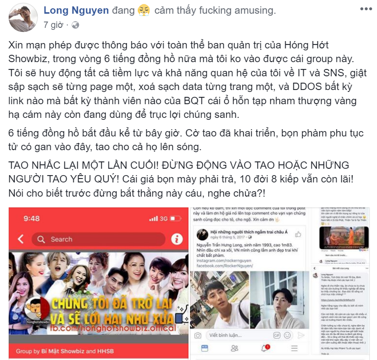 Tuy nhiên, chỉ mới đây thôi, nam ca sĩ - diễn viên vừa khiến hàng ngàn cô gái “vỡ mộng” bởi những phát ngôn có phần bốc đồng, mất kiểm soát trên mạng xã hội. Cụ thể, Rocker Nguyễn bắt đầu “nổi khùng” khi phần giới thiệu được cho là tích cực của bản thân lại gặp phải nhiều bình luận trái chiều từ phía cộng đồng mạng. Anh chàng tỏ ra khá kích động, dùng lời lẽ nặng nề, thậm chí đe dọa đánh sập trang fanpage đã tung tin không chính xác về mình.