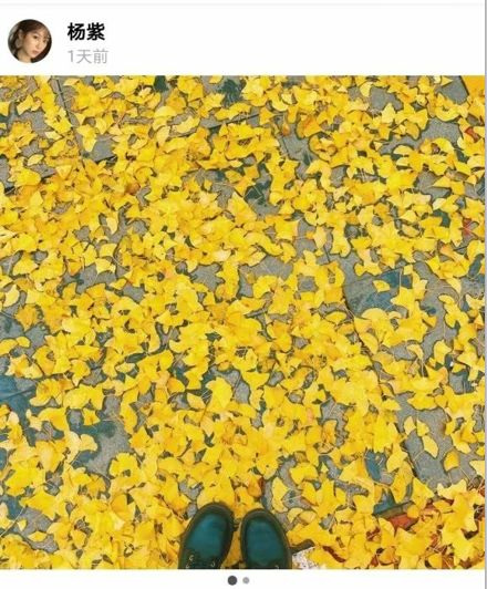 Trong hình của Dương Tử, dưới đất trải đầy lá vàng, để lộ hai mũi giày kèm theo bài viết: “Làm việc vui vẻ, hôm nay vẫn là Tiểu Dương nỗ lực làm việc”. Còn bài đăng của Vương Tuấn Khải không kèm bất kỳ lời bình nào, chỉ chụp những tán cây lớn lá vàng.