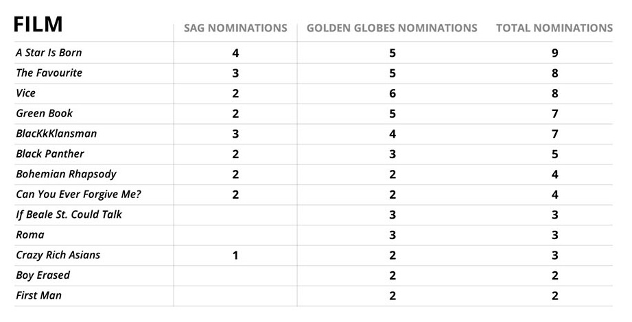 Được đề cử Quả cầu vàng và Giải thưởng của Nghiệp đoàn Diễn viên Màn ảnh (SAG Awards) không phải lúc nào cũng là dấu hiệu giúp một tác phẩm tranh giải Oscar, nhưng những năm gần đây, dường như những ứng viên hàng đầu đều nằm trong số đó (Moonlight và La La Land năm 2017, Ba Billboards và The Shape of Water năm 2018). Chính vì vậy, càng nhiều tác phẩm hy vọng được góp mặt trong danh sách đề của của 2 giải thưởng nghệ thuật điện ảnh danh giá này.