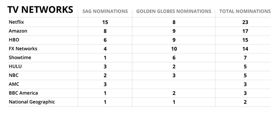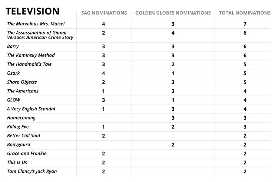 Các tác phẩm lãng mạn như The Marvelous Mrs. Maisel, Barry, The Assassination of Gianni Versace: American Crime Story dẫn đầu đường đua phim truyền hình. Trong khi đó, ở hạng mục dịch vụ truyền hình, Netflix bỏ xa các đối thủ còn lại như Amazon, HBO, FX,… với tổng điểm lên tới 23.
