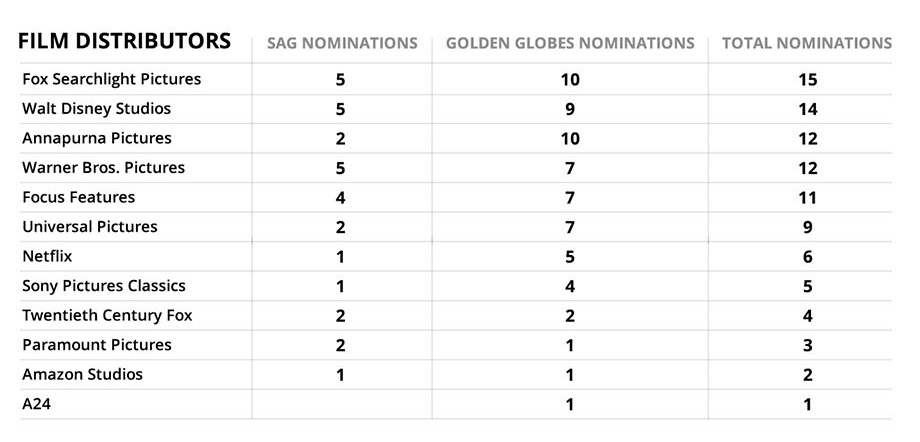 Cuối cùng là danh sách đề cử của các nhà phân phối. Không quá bất ngờ khi Fox Searchlight Pictures chiếm vị trí số 1 với tổng cộng 15 điểm, chỉ hơn 1 điểm với đối thủ cạnh tranh cực mạnh là Walt Disney Studios (14 điểm). 2 gã khổng lồ Netflix và Amazon ở đấu trường này chỉ khiêm tốn nằm vị trí thứ 7 và 11 với tổng điểm lần lượt là 6 và 2.