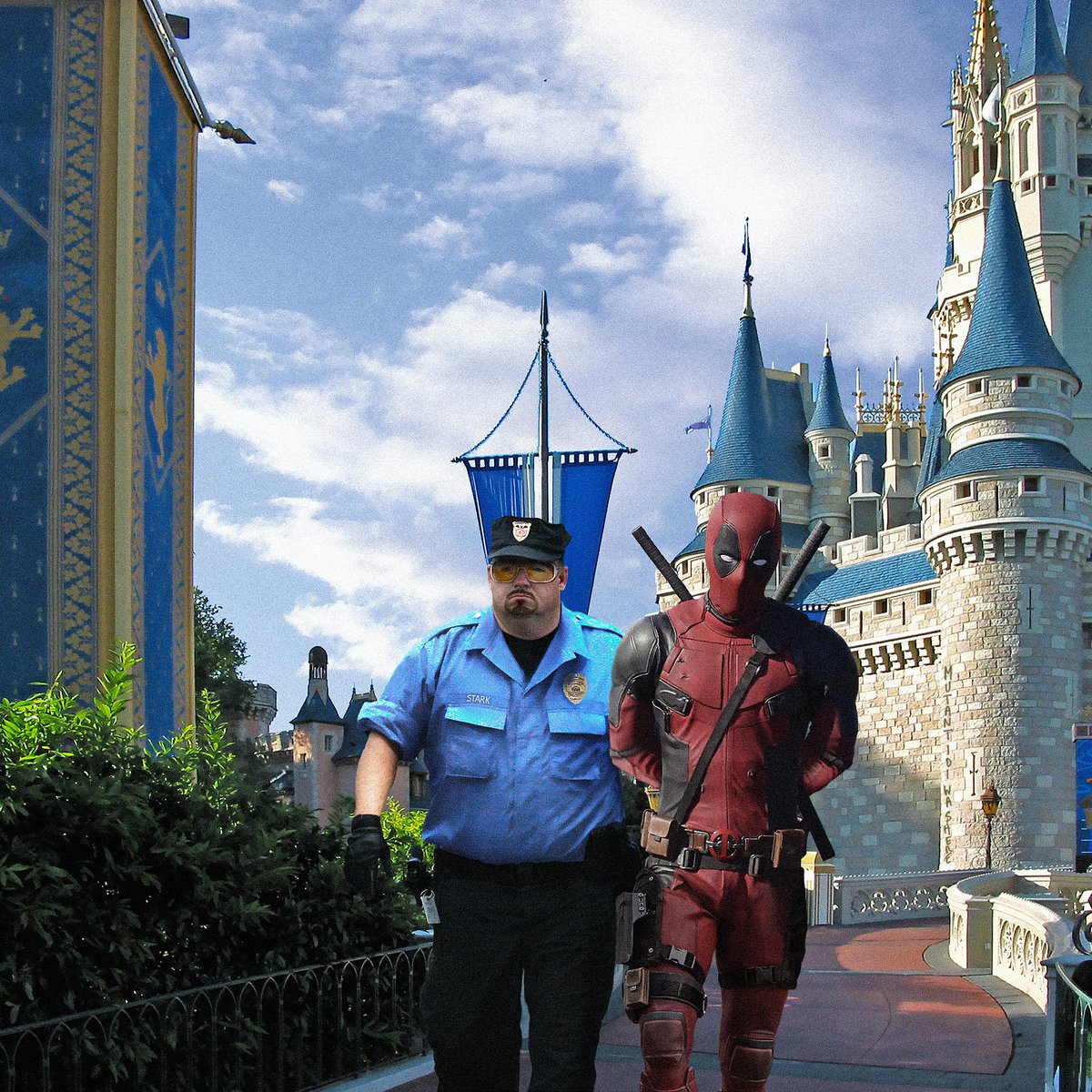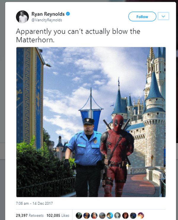 Mới đây, trên Twitter của mình, nam diễn viên Ryan Reynolds đã có hành động trêu chọc nhân vật Deadpool của mình, một kẻ luôn hư hỏng nhưng giờ đây phải chịu sự kiềm kẹp của Nhà Chuột ngoan hiền. Reynolds đăng tải một bức ảnh về vai diễn Deadpool bị bảo vệ áp giải rời khỏi Disneyland sau khi tham gia một phi vụ nổi loạn.