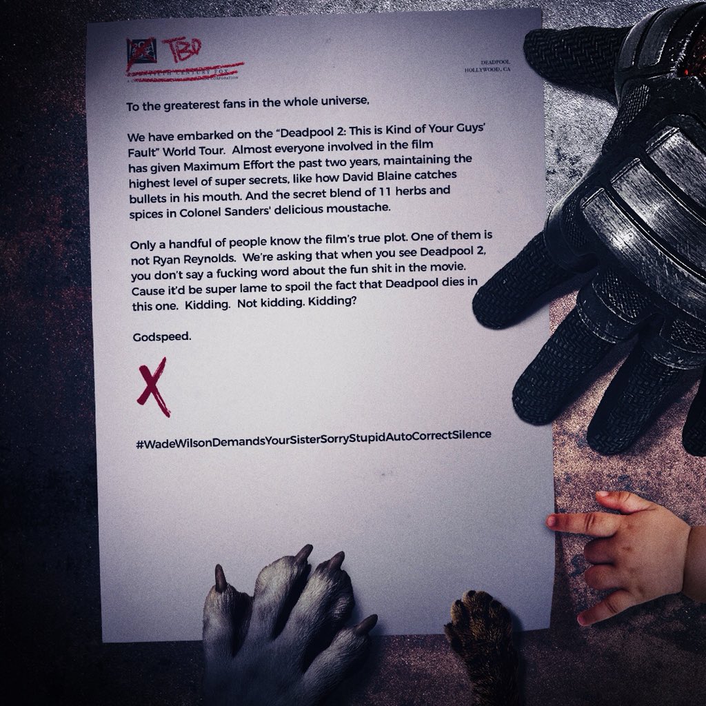 Đúng với bản chất bỉ bựa của mình, gã siêu anh hùng Deadpool - người cũng sẽ ra mắt bom tấn siêu anh hùng chỉ chưa đầy một tháng sau Infinity War - đã nhanh tay bắt chước chiến dịch này. Mới đây, một bức thư với lời lẽ siêu hài đã được nam diễn viên Ryan Reynolds đăng lên tài khoản Twitter của mình.