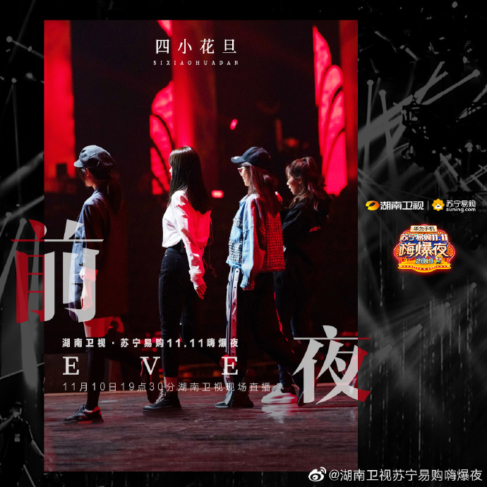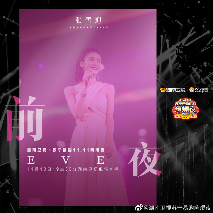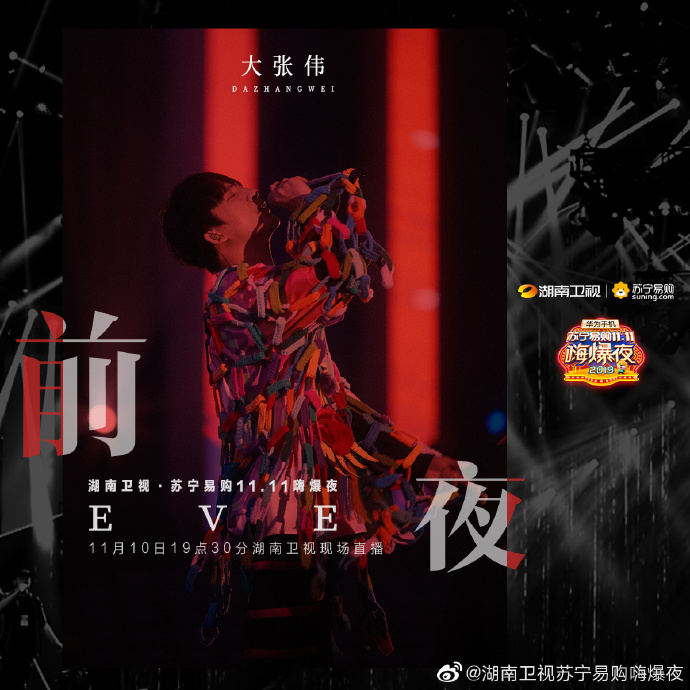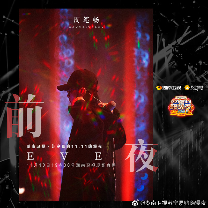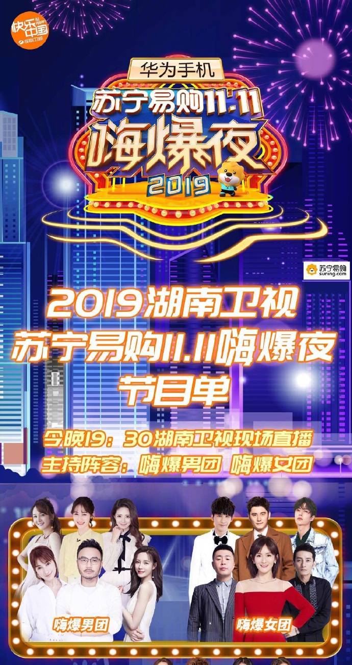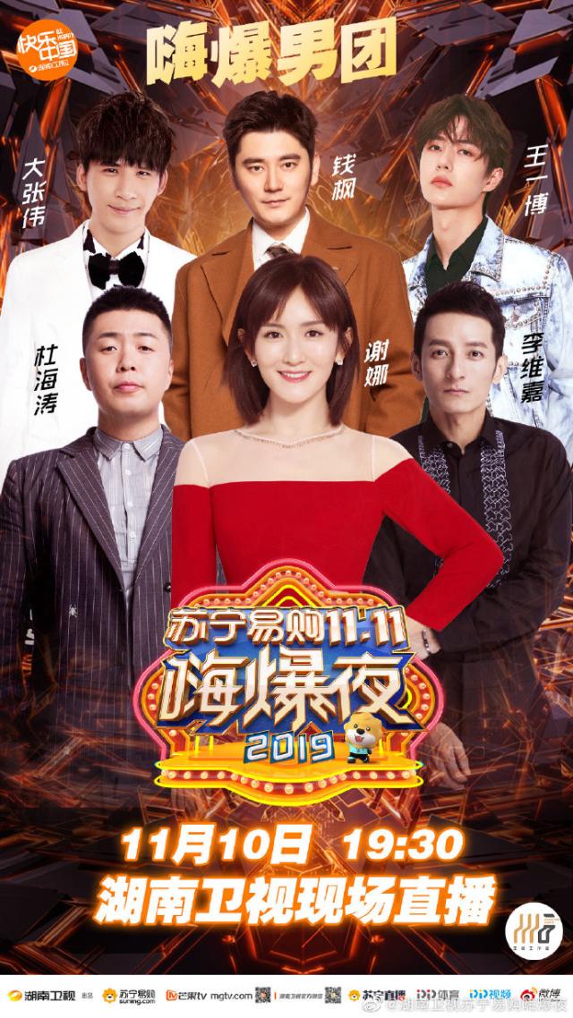 Vào tối ngày 19:30, sự kiện Đêm High bùng nổ 11.11 Suning 2019 sẽ chính thức được phát sóng trực tiếp trên đài Hồ Nam với sự góp mặt của nhiều nghệ sĩ trẻ nổi tiếng. Trong đó có sự tham gia của Vương Nhất Bác, Tiêu Chiến, Dương Dương, Uông Tô Lang, Trịnh Sảng, Hứa Ngụy Châu, Ngô Diệc Phàm, Huỳnh Hiểu Minh, Triệu Vy, Giang Sơ Ảnh, Rocket Girls 101, R1SE, Thẩm Mộng Thần, Trương Lượng Dĩnh, Ngô Thành Phong, Châu Đông Vũ, Henry Lau, Thái Y Lâm,…