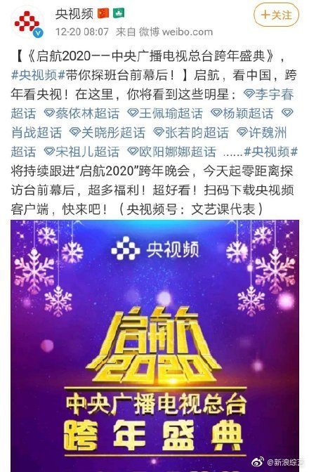 Weibo chính thức của CCTV đã công bố danh sách một số nghệ sĩ sẽ đến tham dự gala mừng xuân 2020 của đài mình gồm những cái tên như Tiêu Chiến, Angelababy, Lý Vũ Xuân…