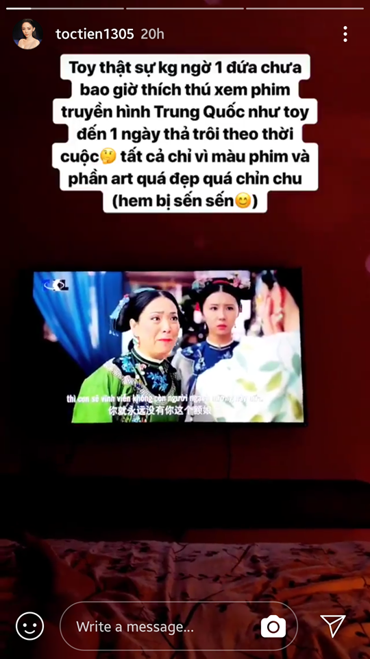 Trong đoạn story Instagram được chủ nhân hit Có ai thương em như anh đăng tải cách đây không lâu, có thể thấy nữ ca sĩ đang vừa đắp mặt nạ thư giãn, vừa xem tập Diên Hi công lược. Đặc biệt, dòng trạng thái đăng kèm của Tóc Tiên cũng khiến khán giả không khỏi thích thú: