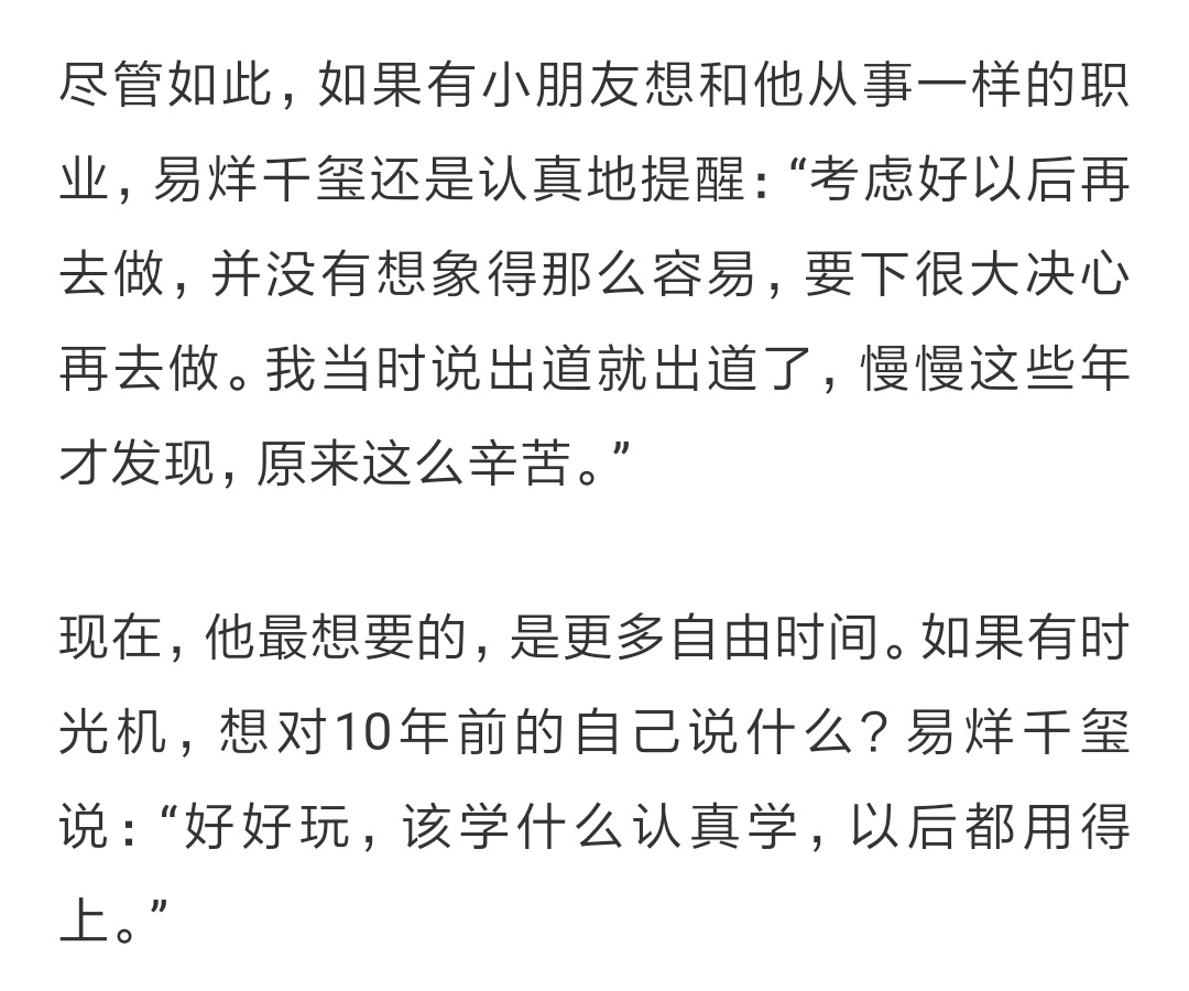 Hiện tại, Thiên Tỉ muốn nhất đó chính là có được nhiều thời gian tự do. Nếu có cổ máy thời gian, Dịch Dương Thiên Tỉ muốn nói với mình của 10 năm trước rằng: “Hãy chơi vui đi, cái nào cần học phải học cho chắc chắn, ngày sau đều dùng được”.