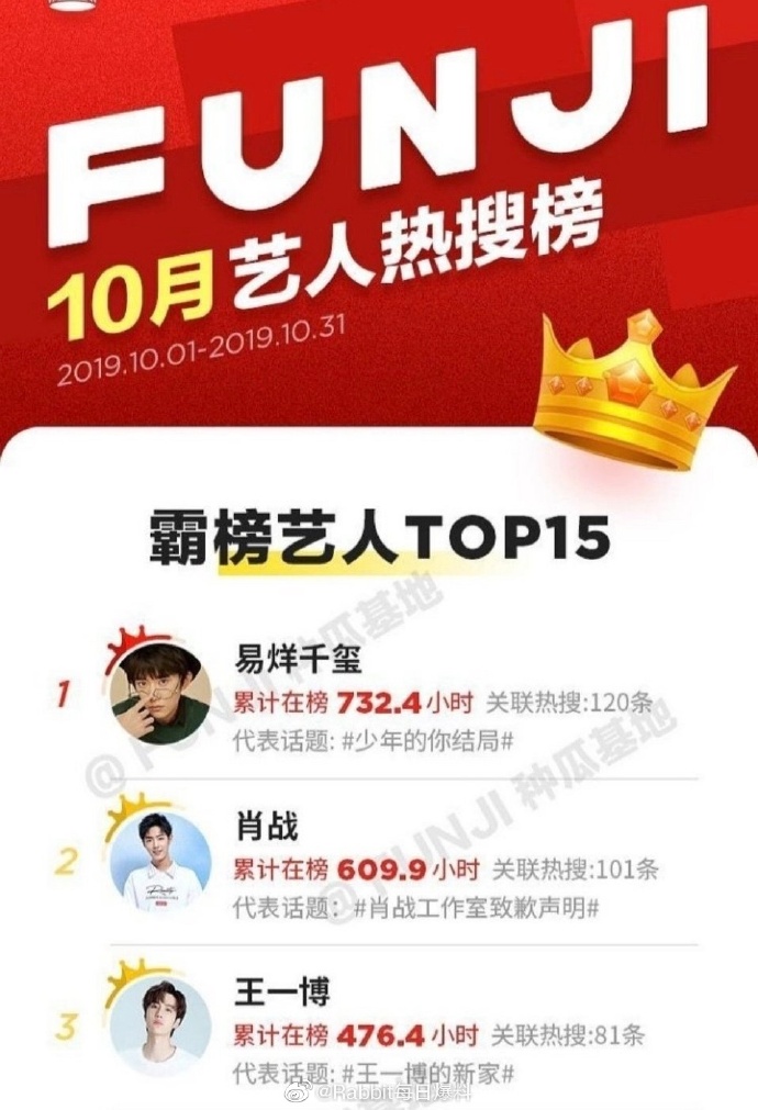 Bảng xếp hạng nhiệt sưu của nghệ sĩ tháng 10 năm 2019 đã ra lò. Top 3 vị trí đầu tiên đã thuộc về Dịch Dương Thiên Tỉ, Tiêu Chiến và Vương Nhất Bác.