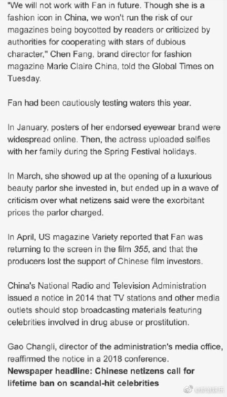 Vào đêm khuya, một nguồn tin lan truyền trên Weibo cho rằng tạp chí Marie Claire đã tuyên bố sẽ không bao giờ hợp tác với Phạm Băng Băng trong tương lai. Tin tức này bắt nguồn từ bài viết của trang báo Global Times (Ấn bản của tạp chí Trung Quốc với phiên bản Tiếng Anh chủ yếu nói về các vấn đề quốc tế), trong đó có một đoạn được nói đến như sau: