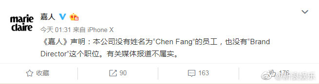 Tin đồn được lan truyền với tốc độ chóng mặt ngay trong đêm thu hút rất đông sự chú ý và quan tâm của dân mạng dù trời đã tối khuya tại Trung Quốc (tin bắt đầu lan truyền từ lúc 23 giờ theo giờ Trung Quốc). Chỉ 2 tiếng sau, lúc 1 giờ sáng, đích thân tài khoản Weibo chính thức của Marie Claire phát thông báo chính thức, phủ nhận tin đồn thất thiệt này: “Marie Claire tuyên bố: Quý công ty không có nhân viên nào có họ tên là Chen Fang, cũng không hề có chức vị Brand Director nào cả. Báo cáo truyền thông đưa tin là sai sự thật“.
