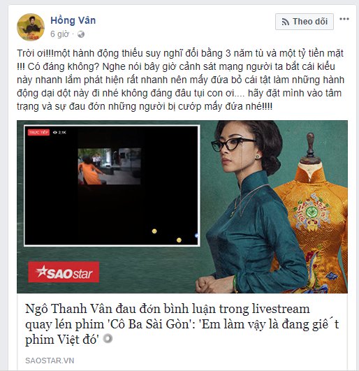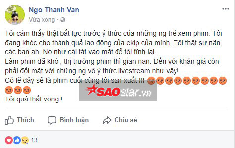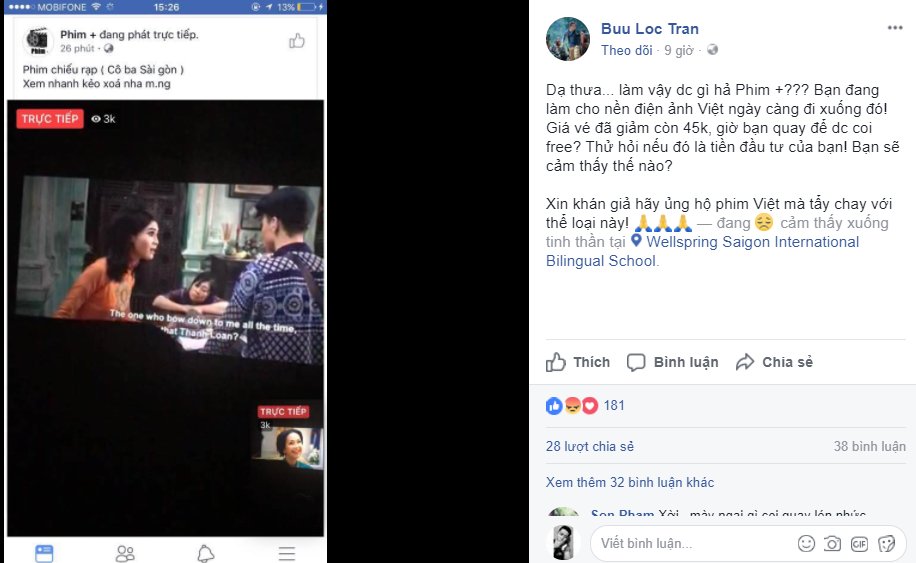 Trước đó, Ninh Dương Lan Ngọc, nữ chính của phim Cô Ba Sài Gòn cũng đã chia sẻ với SAOStar khi sự việc xảy ra: “Làm phim dở thì không ai xem, làm phim hay thì bị livestream, bị phá, ảnh hưởng đến doanh thu. Công sức của bao nhiêu người, chỉ vì những người vô ý thức mà làm người làm phim, diễn viên phải chán nản”.