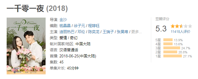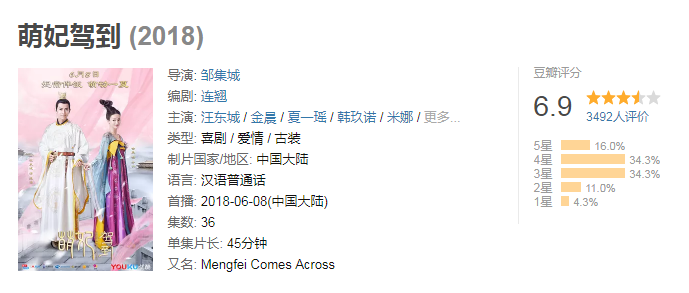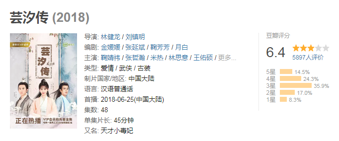 Các bộ phim có điểm số ở mức trung bình có thể kể đến là Manh phi giá đáo (Kim Thần, Uông Đông Thành) đạt 6,9 điểm, Vân Tịch truyện (Cúc Tịnh Y, Trương Triết Hạn) có được 6,4 điểm và Nghìn lẻ một đêm (Địch Lệ Nhiệt Ba, Đặng Luân) được đánh giá với số điểm là 5,3.