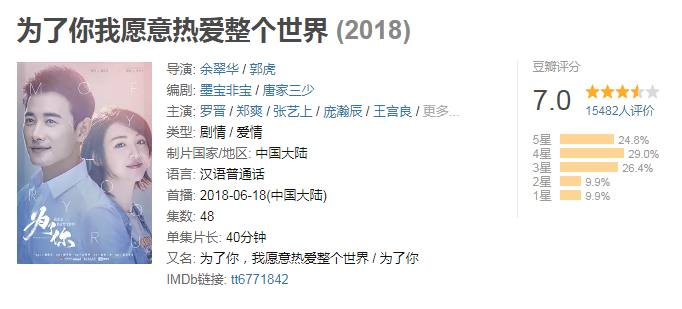 Đứng đầu về điểm số là bộ phim vừa mới công chiếu gần đây Vì em anh nguyện yêu cả thế giới với sự kết hợp đầy mới lạ giữa Trịnh Sảng và La Tấn. Vì em anh nguyện yêu cả thế giới trước khi trình chiếu đã có nhiều đánh giá không tốt, tuy nhiên sau khi phim lên sóng lại thu hút nhiều sự quan tâm hơn. Điểm số của bộ phim là 7 và đồng thời có những lời nhận xét rất tốt.