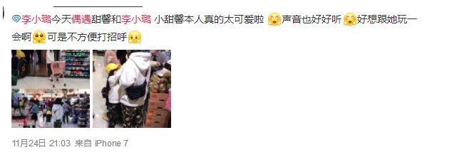 Ngày 24.11 vừa qua, có người bỗng nhiên gặp được Lý Tiểu Lộ cùng con gái Điềm Hinh xuất hiện tại siêu thị. Đây cũng là lần đầu tiên Lý Tiểu Lộ xuất hiện ở nơi đông người sau khi tuyên bố ly hôn với Giả Nãi Lượng và ngầm công khai qua lại với PGone.