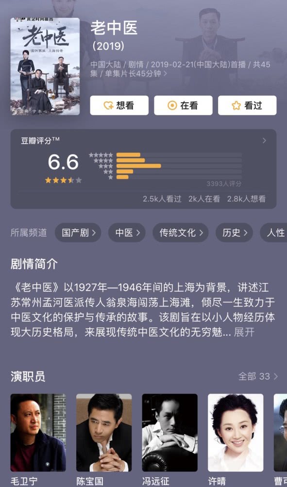 Lão trung y (老中医) với sự tham gia của dàn diễn viên gạo cội: Trần Bảo Quốc, Phùng Viễn Chinh, Hứa Tình, Hoắc Thiên Lâm… Phải nói đây là một dàn diễn viên khá bắt mắt, tất cả các diễn viên chính đều là những diễn viên phái thực lực. Đáng lẽ đây sẽ là một bộ phim rất nổi tiếng, nhưng đáng tiếc vì sự việc của Hoắc Thiên Lâm mà đoàn phim phải xóa tất cả những phần kịch của anh cho nên bộ phim có những cảnh đứt quãng không liền mạch, cuối cùng phim chỉ đạt 6,6 điểm.
