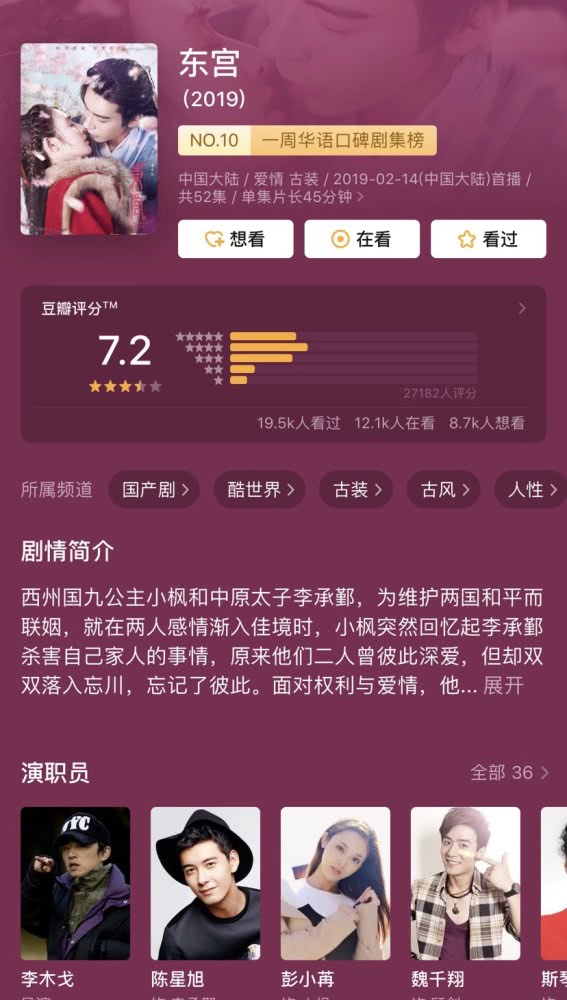 Đông cung (东宫) do Bành Tiểu Nhiễm và Trần Tinh Húc đóng chính, phim được đánh giá 7,2 điểm. Nam chính và nữ chính trong Đông cung không phải các diễn viên nổi tiếng, cũng không phải các diễn viên lưu lượng, họ chỉ đơn thuần là những gương mặt mới của giới giải trí, tuy nhiên bộ phim này vẫn nhận được sự công nhận và yêu thích của khán giả. Đông cung được khen cả về trang phục và các cảnh quay thực, mỗi một tạo hình của nữ chính đều khiến khán giả có những cảm giác mới lạ khác nhau, thành tích 7,2 điểm cũng chính là kết quả tâm huyết của đoàn làm phim.