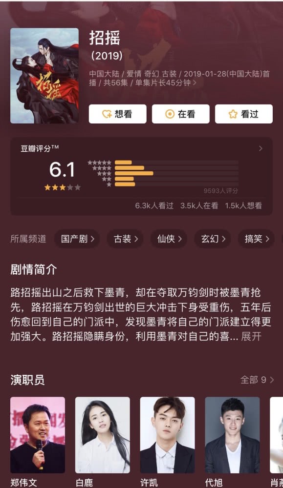 Chiêu Diêu (招摇) do Hứa Khải và Bạch Lộc đóng chính được đánh giá 6,1 điểm. Hai diễn viên chính của bộ phim này đều là những diễn viên mới của làng giải trí Hoa Ngữ, thậm chí bộ phim này cũng không được tuyên truyền rầm rộ như các bộ phim khác. Nhưng sau khi lên sóng, có không ít khán giả đều cho rằng đây là một bộ phim khá hay. Sự hợp tác của Hứa Khải và Bạch Lộc cũng khiến khán giả cảm thấy hài lòng, cốt truyện cũng thuộc thể loại tình cảm ngược tâm mà khán giả vốn yêu thích, phần trang phục tạp hình cũng khá ổn, mang phong cách riêng của bộ phim này. Tuy Chiêu Diêu không thể thực sự nổi tiếng, nhưng đây cũng là một kết quả không tồi đối với những diễn viên mới như Hứa Khải và Bạch Lộc.