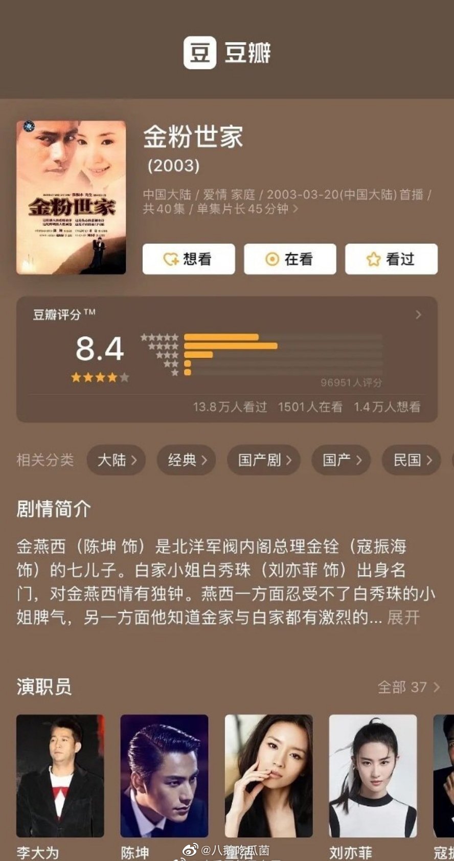 Mới đây, dân mạng phát hiện trong sự nghiệp diễn xuất của Lưu Diệc Phi từ trước tời giờ chỉ diễn qua 4 bộ phim truyền hình (chỉ tính phim đã được ra mắt) nhưng tất cả những tác phẩm đó đều rất thành công, đạt điểm đánh giá rất cao trên Douban. Ngoại trừ Thần điêu đại hiệp được số điểm 7.3 thì những bộ phim còn lại đều trên 8 điểm.