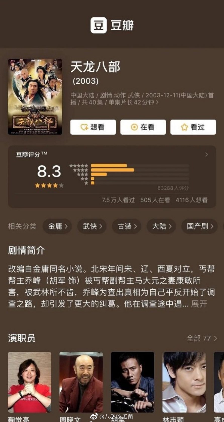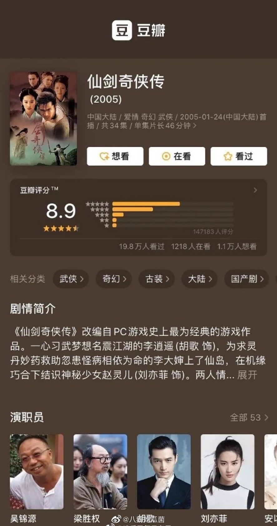 Các bộ phim đó gồm Kim phấn thế gia với 8.4 điểm, Thiên long bát bộ với 8.3 điểm, Tiên kiếm kỳ hiệp với 8.9 điểm và Thần điêu đại hiệp 7.3 điểm.