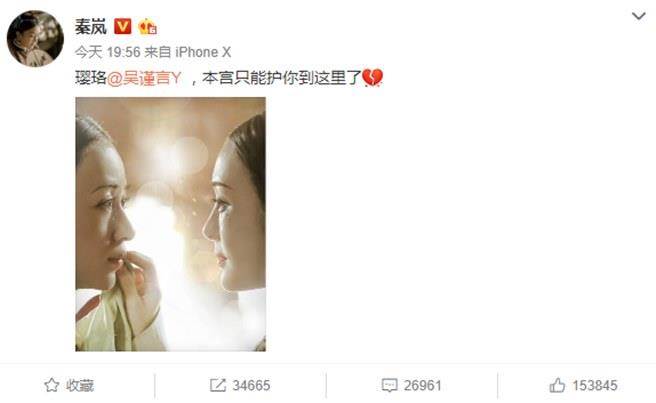 Khi mọi người vẫn chưa nguôi được nỗi buồn khi nhân vật Phú Sát hoàng hậu “nhận cát xê” thì ở ngoài đời thật, vào tối ngày hôm qua, nữ diễn viên đảm nhận vai diễn Phú Sát hoàng hậu là Tần Lam đã đăng tải dòng trạng thái đầy tâm trạng lên mạng xã hội Trung Quốc với nội dung: “Anh Lạc @Ngô Cẩn Ngôn, bổn cung chỉ có thể bảo vệ người đến đây thôi“. Ngay sau khi dòng trạng thái này được đăng tải thì cụm từ bốn chữ “Hoàng hậu xuống đài” đã nhanh chóng leo lên dành vị trí đầu tiên trong bảng xếp hạng tìm kiếm Weibo, cụm từ này đã được hơn hai triệu cư dân mạng tìm kiếm, từ đây có thể thấy được sức hút của Hoàng hậu nương nương đối với khán giả vốn không hề nhỏ.