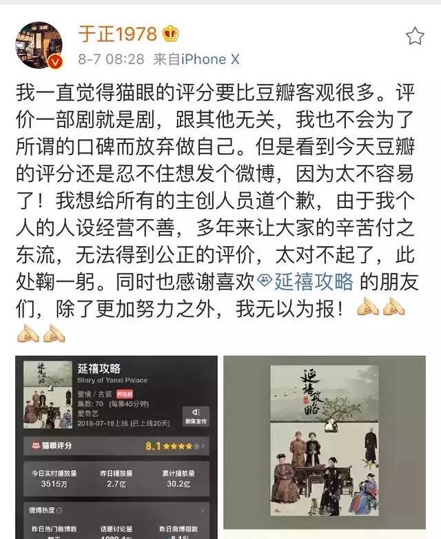 “Tôi vẫn luôn cảm thấy rằng số điểm đánh giá bên maoyan khách quan hơn nhiều so với bên douban, đánh giá một bộ phim thì chỉ đánh giá vào phim, không nên liên quan đến những thứ khác. Sau khi tôi nhìn thấy điểm douban của ngày hôm nay liền không chịu được mà phát Weibo, tôi muốn gửi lời xin lỗi đến các nhân viên chế tác, là do bản thân tôi kinh doanh không tốt, nhiều năm này đã khiến cho mọi người khổ cực vất vả, nhưng lại không thể nào đạt được số điểm công bằng, quá có lỗi rồi, xin cuối đầu xin lỗi. Đồng thời cũng cảm ơn những khán giả đã yêu thích bộ phim Diên Hi công lược, ngoại trừ cố gắng nỗ lực hơn nữa, tôi cũng không biết phải báo đáp bằng gì nữa!”.